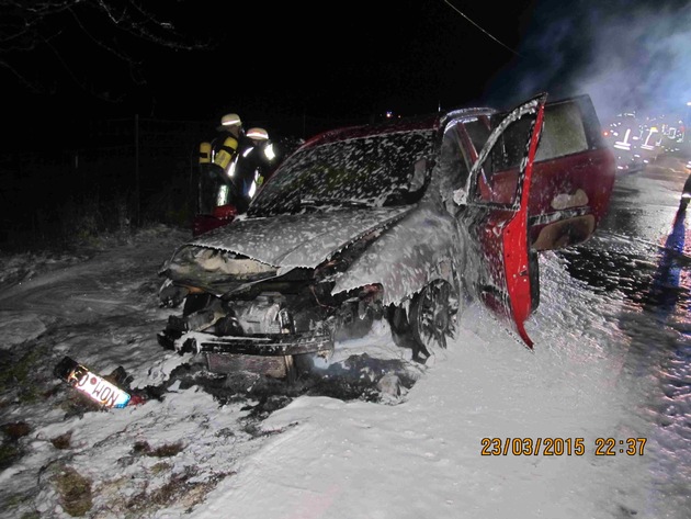Mit dem Schrecken davon kam am gestrigen späten Abend, 23.03.2015, 22:10 Uhr, ein 70jähriger Fiat-Fahrer auf der Landesstraße 549 im Bereich Silberborn. Während der Fahrt schlugen plötzlich Flammen aus dem Motorraum des Fahrzeugs. Trotzdem der Fahrer sofort anhielt und die eingesetzte Feuerwehr den Brand schnell löschen konnte, war das Fahrzeug insgesamt nicht mehr zu retten. Die Flammen hatten bereits aus dem Motorraum auch die gesamte Fahrgastzelle erreicht, so dass der Fiat Stilo nahezu komplett ausbrannte. Personenschaden entstand nicht.