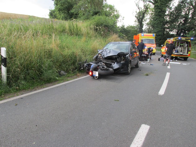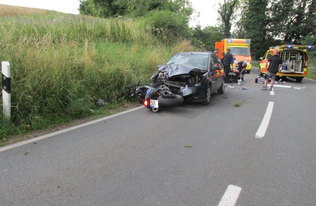 Am Dienstag, 04. August, gegen 13:26 Uhr, ereigente sich auf der Landesstraße 427 zwischen Falkenhagen und Polle ein Verkehrsunfall bei dem ein 30-jähriger Motoradfahrer aus Extertal schwer verletzt wurde. Aufgrund der Verletzungen wurde der Motorradfahrer mit dem hinzugerufenen Rettungshubschrauber Christoph 44 in die MHH nach Hannover geflogen. Der Motorradfahrer hatte die L 427 von Falkenhagen in Richtung Polle befahren. Im Landkreis Holzminden ist er dann nach dem Durchfahren einer Rechtskurve auf die Gegenfahrbahn geraten und mit einem entgegenkommenden Pkw Ford frontal zusammengestoßen. Die 49-jährige Fahrerin des Ford wurde bei dem Unfall leicht verletzt.