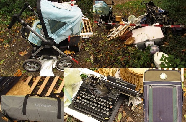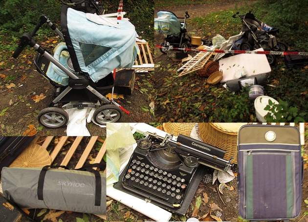 Bei den entsorgten Gegenständen handelt es sich u.a. um eine alte "Continental"-Schreibmaschine, ein Traxx-Cruiser-Kinderwagen, ein Hauck-Kinderwagen, in Spacecase-Reisetrolley und ein verpacktes Zelt der Marke "Skyroc Mali 3".