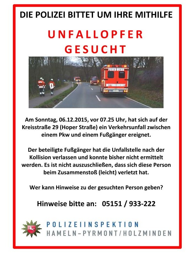 (Hameln) Am Sonntagmorgen kam es auf der Kreisstraße 29 bei Halvestorf zu einer Kollision zwischen einem Pkw und einem Fußgänger. Trotz umfangreicher Suchmaßnahmen konnte das mögliche Unfallopfer bis jetzt nicht aufgefunden werden (wir berichteten bereits in einer Pressemitteilung, siehe unten Link 1).