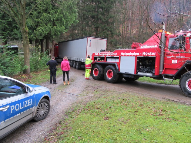 Für die Polizei keine Seltenheit bei wochenlangen Witterungen wie momentan: Schwere Fahrzeuge "sacken" im Straßennebenraum aufgrund des aufgeweichten Erdreichs ein und kippen um bzw. drohen mindestens umzukippen und sind nicht in der Lage, sich aus einer solchen Situation ohne fremde Hilfe zu befreien. So auch geschehen am gestrigen Mittwochvormittag, als ein Sattelzug im Bereich der Revierförsterei Rottmünde in der Gemarkung Boffzen aufgrund der Straßenführung zwangsläufig auf den Straßennebenraum geriet. Letztlich hatte der Fahrer aber noch Glück im Unglück, soll heißen, der Sattelzug sackte zwar stark ein, konnte aber nicht umkippen, da ein starker Baum im Straßennebenraum ein Umkippen des Sattelaufbaus verhinderte. Allerdings hatte der Fahrer mit eigenen Mittel keine Chance, sich wieder selbst zu befreien. Nur mit dem Einsatz von "schwerem Gerät" war es schließlich möglich, den Sattelzug aus der misslichen Lage zu befreien, ohne dass nennenswerter Schaden entstanden ist. Vor diesem Hintergrund ist das hiesige Polizeikommissariat sehr froh, im Bereich ein sehr leistungsstarkes Unternehmen zu wissen, dass mit derartigen Problemstellungen äußerst sach- und fachgerecht klar kommt.