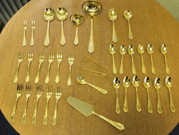 Möglicherweise handelt es sich bei dem 34teiligen hartvergoldeten Essbesteck um Diebesgut. Denn alltäglich ist die Fundsache, die ein Mitbürger aus Eschershausen im Lenner Bachlauf am Samstagmittag, 12.03.2016, gefunden hat, sicherlich nicht. Mit Hilfe der Feuerwehr Eschershausen konnten die Besteckteile an der Nordseite der Brück über die Bahnhofstraße schließlich geborgen werden. Die Ermittler der Polizeistation Stadtoldendorf konnten diesen ungewöhnlichen Fund bislang nirgendwo zuordnen, weder einem Einbruchsdiebstahl, noch sonst einem gemeldeten Verlust. Vor diesem Hintergrund bittet die Polizeistation Stadtoldendorf unter Tel 05532 / 90130 um Hinweise, wer die abgebildeten Gegenstände vermisst oder Hinweise darauf geben kann, woher diese stammen.