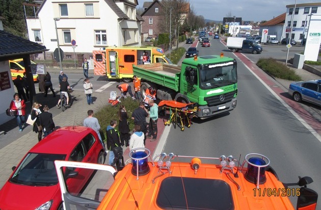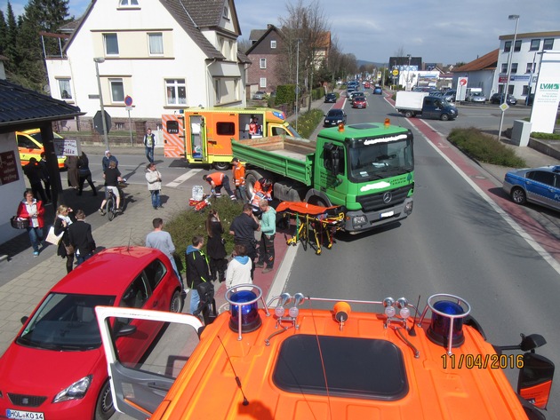 Mit schweren Verletzungen musste am heutigen Nachmittag ein 39jähriger Zweiradfahrer zunächst in das Krankenhaus Holzminden und später in die Medizinische Hochschule Hannover eingeliefert werden, nachdem ein LKW beim Abbiegen seitlich mit dem Radfahrer kollidiert war. Gegen 14:45 Uhr befuhr der 44jährige Fahrer eines LKW die Bergstraße und wollte nach rechts auf die Allersheimer Straße in Richtung Innenstadt einbiegen. Dabei kollidierte sein Fahrzeug mit einem seitlich neben ihm befindlichen Radfahrer, der rechts neben den LKW gefahren und dann von seinem Fahrrad abgestiegen war. Der Mann geriet mittig unter den LKW und wurde von den hinteren rechten Zwillingsreifen im Bereich der Hüfte erfasst. Dabei wurde der 39jährige Zweiradfahrer schwer aber glücklicherweise nicht lebensgefährlich verletzt.