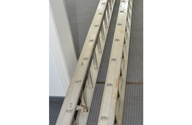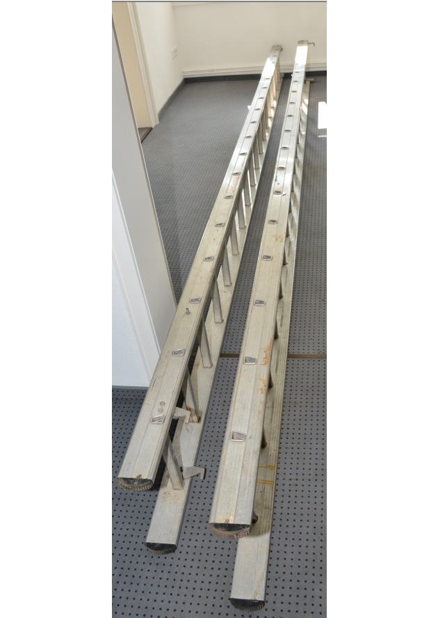 Es handelt sich um eine 2-teilige Sprossen-Schiebeleiter aus Aluminium, Gesamtlänge 10,40 Meter, Länge der Einzelteile 5,20Meter. Auffällig sind bräunliche Farb- bzw. Lasurreste an den Leiterholmen, die von Streicharbeiten des Eigentümers stammen könnten.