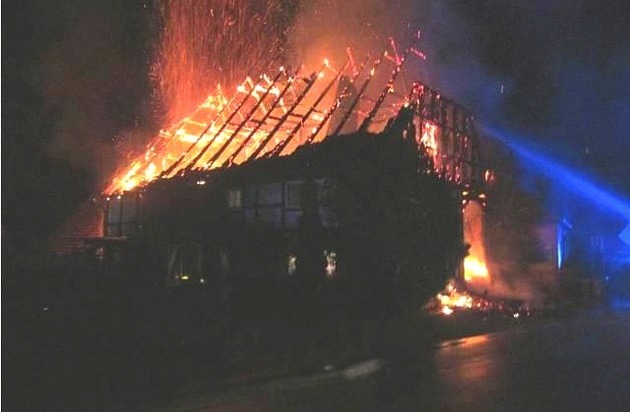 (Aerzen) Am Mittwoch, 01.06.2016, kurz nach Mitternacht, kam es in einem Wohngebäude (Fachwerkhaus) mit angrenzender Scheune zu einem Brandausbruch. Das Fachwerkhaus wurde zerstört. Die beiden Anwohner (31 und 46) konnten das Gebäude rechtzeitig verlassen, wurden dennoch leicht verletzt (wir berichteten).