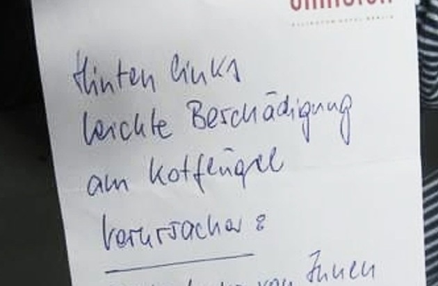In einer Verkehrsunfallfluchtsache sucht der zuständige Ermittler des Fachkommissariats 7 der Hamelner Polizei den Verfasser eines Notizzettels, der an der Unfallstelle zurückgelassen wurde.