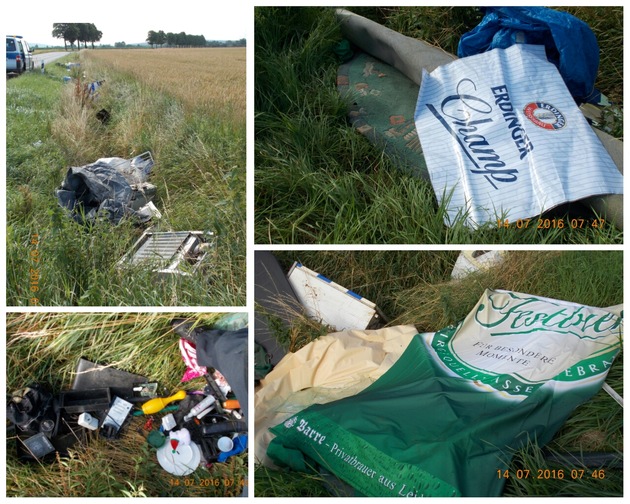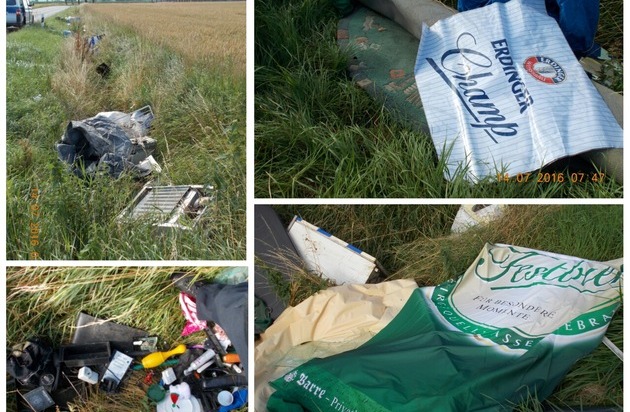 Neben Hausmüll, Elektro- und Haushaltsgeräte, Spielzeug und einem Teppich befanden sich im Abfall Gegenstände, die Rückschlüsse auf den Verursacher zulassen könnten. Ein weiß-grünes Werbebanner hatte den Aufdruck "Barre - Privatbrauer aus Leidenschaft" sowie "Festbier - Für besondere Momente". Eine weitere Folie war mit Werbung von "Erdinger Weissbräu" bedruckt.
