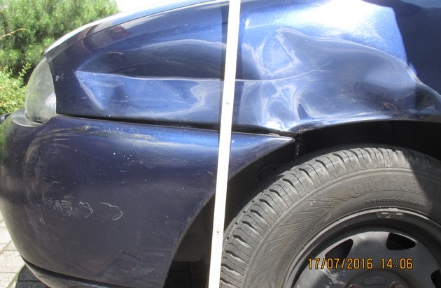 In dem Zeitraum vom vergangenem Samstag Nachmittag bis Sonntag Mittag kam es in der Sahlfeldstraße in Bodenwerder zu einer Verkehrsunfallflucht. Ein ordnungsgemäß geparkter blauer Fiesta wurde vorne links am Kotflügel und Rad so stark beschädigt, dass eine Weiterfahrt unmöglich war. Diesen Unfall muß der Unfallflüchtige oder vielleicht auch Passanten / Anwohner bemerkt haben! Unfallspuren wurden gesichert. Die Polizei sucht nun Unfallzeugen und bittet um Hinweise unter der Rufnummer: 05533 - 974 950.