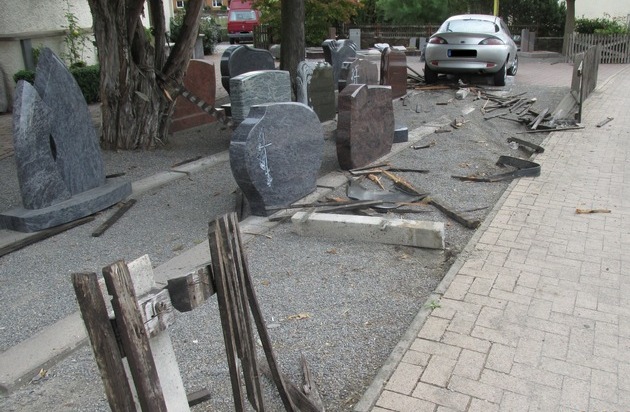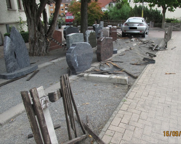 Am Freitag, dem 16.09.2016, ereignete sich um 14.40 Uhr, ein spektakulärer Unfall auf der Hagener Straße. Ein 30-jähriger Bad Pyrmonter war mit seinem Pkw Ford auf der Hagener Straße Richtung Schillerstraße unterwegs. Im Bereich des Friedhofsweges bemerkte der Mann in seinem Fahrzeug eine Wespe, die ihn derart in Panik versetzte, dass er das Steuer seines Fahrzeugs zunächst nach rechts verriss. Dann lenkte er gegen, überfuhr die Gegenfahrspur und den Gehweg, brach durch einen Zaun und in eine dort aufgestellte Grabsteinausstellung. Beim Überqueren des Gehweges konnte sich ein 26-jähriger Mann aus den neuen Bundesländern nur durch einen Sprung zur Seite und Abrollen auf dem Gehweg vor dem Ford in Sicherheit bringen. Dabei verletzte der Mann sich leicht am Fuß. An dem Pkw und auf dem Grundstück entstand nach ersten Schätzungen ein Sachschaden von etwa 15.000 Euro.