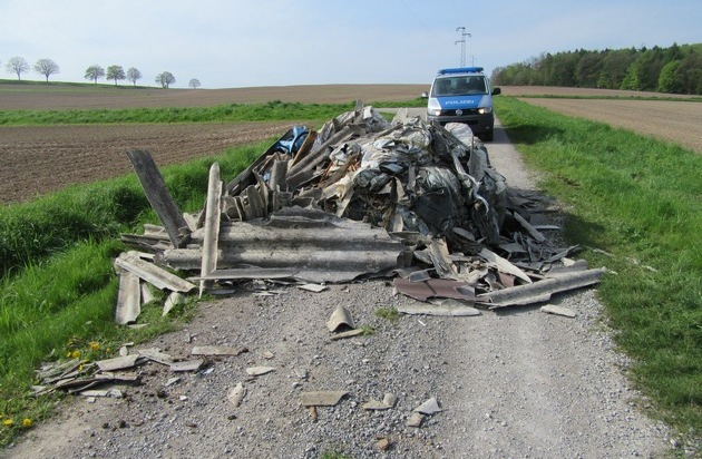 Vermutlich am 09.05.17, nach 17.30 Uhr wurde durch bisher nicht bekannte Person eine Menge zwischen 5 - 10 m³ Abfall auf Feldwegen in der Gemarkung Holenberg widerrechtlich entsorgt. Im Bereich zwischen dem Bützeberg und dem Odfeld stellten die eingesetzten Beamten der Polizei in Stadtoldendorf entsorgte Materialien u.a. einer Dacheindeckung, Kunststoffplanen, Altreifen sowie Teppichböden fest. Die große Menge an Abfall muss durch ein unbekanntes größeres Transportfahrzeug (Lkw über 7,5 t) abgeschüttet worden sein. Hinweise auf den Verursacher nimmt die Polizei in Stadtoldendorf entgegen (05532/90130).