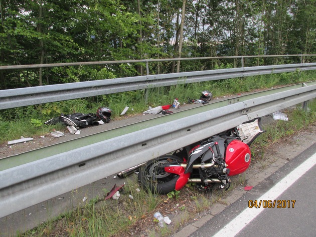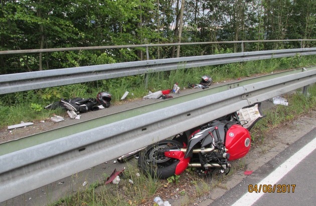 Am 04.06.2017, gegen 18.35 Uhr, verunglückte ein Motorradfahrer auf der Landesstraße 430, zwischen dem Ortsteil Hagen und dem Stadtgebiet Bad Pyrmont. Der 23-jährige Mann aus Ottenstein war gemeinsam mit einem 26-jährigen Freund aus Emmerthal auf Motorrädern unterwegs. Der Ältere fuhr vorweg, der Jüngere folgte. Am Ortseingang Bad Pyrmont stellte der Mann aus Emmerthal auf einmal fest, dass sein Freund nicht mehr nachkam. Bei der Absuche der Strecke fand er den Verunfallten in der letzten scharfen Linkskurve. Sein Motorrad hatte im Kurvenverlauf augenscheinlich mit den Fußrasten aufgesetzt und war anschließend gerade unter die Leitplanke gerutscht. Der Verunglückte selbst konnte sich nicht mehr an den Unfallhergang erinnern. Der Verletzte wurde mit einem RTW ins Sana-Klinikum Hameln gefahren. Das erheblich beschädigte Motorrad wurde abgeschleppt.