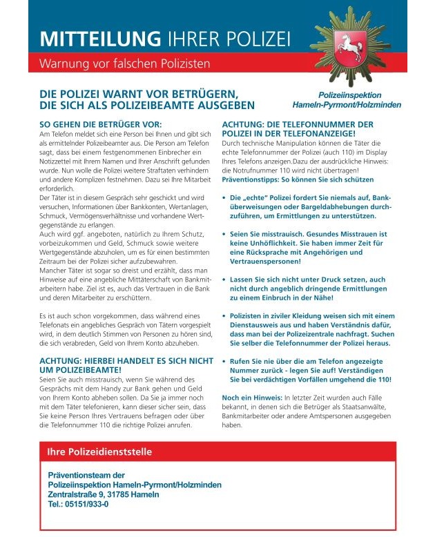 Am gestrigen Montag erhielten einige Bürger im Landkreis Hameln-Pyrmont Anrufe von angeblichen Polizeibeamten.