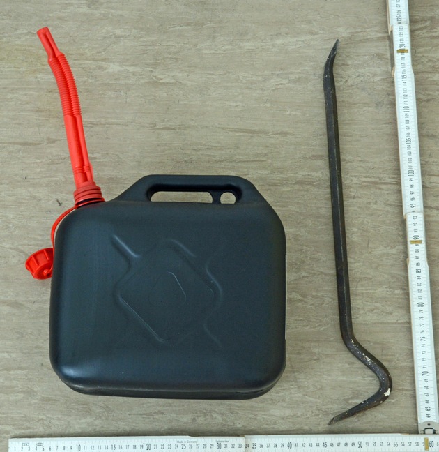 Foto 1: Am Tatort aufgefundener Kanister und Kuhfuß