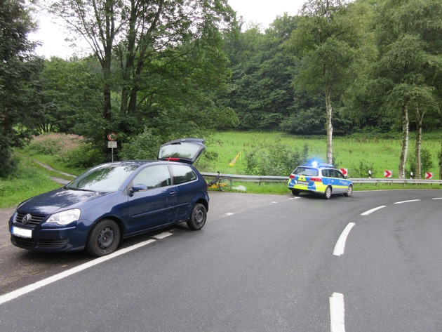 Am Samstag gegen 17:30 Uhr befuhr ein 50-jähriger Holzmindener mit seinem Liegedreirad die Landesstraße 550 von Fürstenberg in Richtung Meinbrexen. Auf der Gefällestrecke geriet dieser dann mit seinem Fahrrad zu Beginn einer starken Rechtskurve auf die Gegenfahrbahn und stieß mit einem entgegenkommenden VW Polo zusammen. Die 55-jährige Fürstenbergerin war mit ihrem Polo auf dem Weg von Meinbrexen in Richtung Fürstenberg. Nach ersten Ermittlungen an der Unfallstelle durch Polizeioberkommissarin Tater vom Polizeikommissariat Holzminden, ist der Fahrradfahrer auf regennasser Fahrbahn aufgrund nicht angepasster Geschwindigkeit aus der Kurve herausgetragen worden und dadurch auf den Gegenfahrstreifen geraten. Aufgrund glücklicher Umstände wurde der Fahrradfahrer, der keinen Fahrradhelm trug, nur leicht verletzt, so dass eine ärztliche Behandlung vor Ort nicht erforderlich war. Am VW Polo und am Fahrrad entstand ein Sachschaden von ca. 2000 Euro.