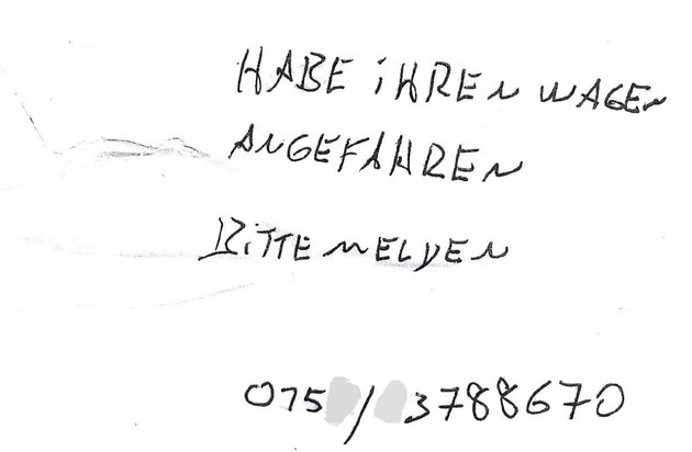 Weder der 38-jährige Hamelner selbst noch die Ermittler der Polizei konnten bislang über diese Nummer jemanden erreichen. Die Nummer sei laut Anzeige im Display nicht vergeben. Daher veröffentlichen wir heute den Notizzettel und hoffen, dass sich entweder der Verfasser der Notiz bei der Polizei meldet oder jemand die Schrift erkennt und uns sagen kann, wer diesen Zettel geschrieben haben könnte. Der Schaden im Heckbereich des Fiat Stilo wird auf mehrere hundert Euro geschätzt.