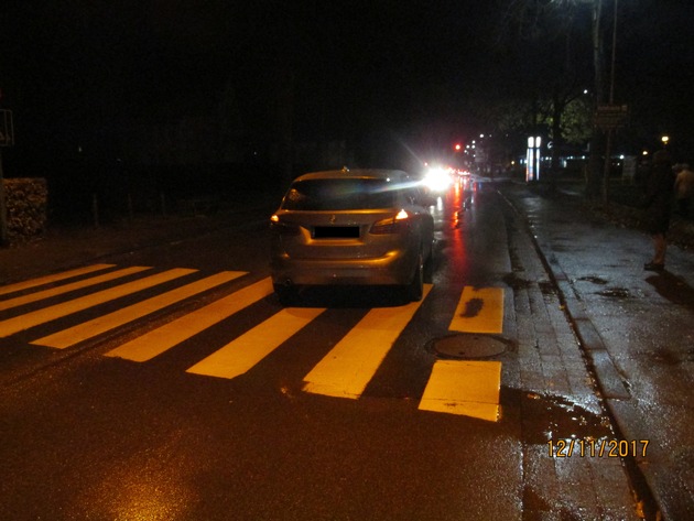 Sehr großes Glück hatte eine 20-jährige Frau aus Bad Pyrmont, die am Sonntag, dem 12.11.2017, gegen 18.25 Uhr, mit ihrem Hund an der Leine den Fußgängerüberweg der Südstraße von der Anzioallee kommend in Richtung Schwimmbad überquerte. Ein in Richtung Holzhausen fahrendes Fahrzeug hielt an, ein in Richtung Bahnhof fahrender Mercedes, von einem 62-jährigen Bad Pyrmont geführt, bremste viel zu spät. Die Frau und ihr Hund wurden mittig von dem Fahrzeug erfasst und zu Boden geschleudert. Dennoch erlitten sie nach eigenen Angaben, keine Verletzungen. Lediglich am Pkw entstand geringfügiger Sachschaden.