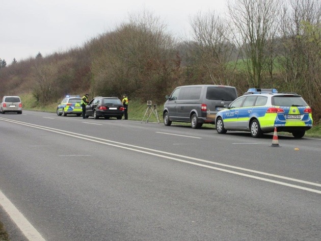 Hintergrund: Die Gefahren für die eingesetzten Beamten in einer solchen Kontrollstelle auf der Bundesstraße sind immens. Um jedoch trotzdem die Hauptunfallursache für schwere Verkehrsunfälle, die überhöhte Geschwindigkeit außerhalb geschlossener Ortschaften, bekämpfen zu können, ist es unerlässlich, auch auf der Bundesstraße 64 Geschwindigkeitsüberwachungen durchzuführen. Das Anhalten vor Ort zum Feststellen der Identität der Fahrzeugführer zeigt dem Verkehrsteilnehmer sofort sein Fehlverhalten auf, was eine höhere Wirkung erzielt. Zur Minimierung der Gefahren für die Kontrollbeamten wurden bereits in der Vergangenheit Maßnahmen getroffen. Die Kontrollstelle wird weit vorher mittels Blinkleuchten angekündigt. Weiterhin ist das Blaulicht der Funkstreifenwagen aktiviert und die Beamten tragen grundsätzlich reflektierende gelbe Jacken oder Überwürfe. Seit dem Jahr 2016 ist zudem ein temporärer Geschwindigkeitstrichter auf letztlich 50 km/h vorhanden, der im Fall einer Kontrolle mittels ausklappbarer Verkehrszeichen durch die Beamten eingerichtet werden kann. Auch der Schriftzug "Polizeikontrolle" auf einem der großen Schilder zeigt dem Verkehrsteilnehmer unmissverständlich die auf ihn zukommende Situation auf. Leider mussten die Kontrollbeamten immer wieder feststellen, dass trotz der genannten umfangreichen Maßnahmen Verkehrsteilnehmer rücksichtslos mit deutlich überhöhter Geschwindigkeit die Kontrollstelle passieren.