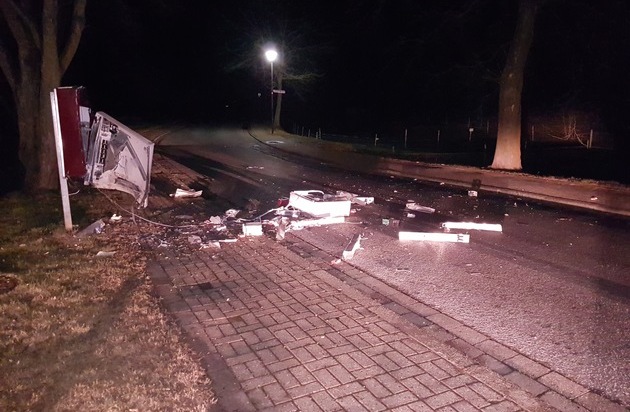 Am frühen Sonntagmorgen gegen 02:00 Uhr sprengten Unbekannte in der Straße Twete in Stadtoldendorf, vor dem Parkplatz eines Gasthauses, einen Zigarettenautomaten und zerstörten diesen dabei vollständig. Die Trümmerteile flogen bei der Detonation teilweise bis zu 25 Meter weit.