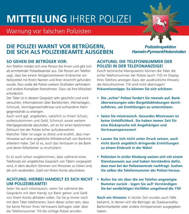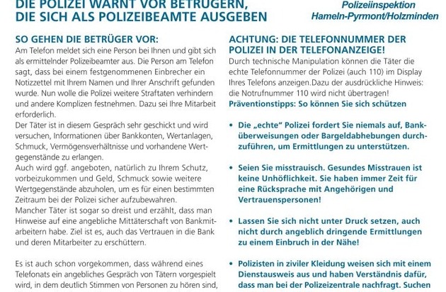 Am gestrigen Donnerstag erhielten mehrere Bürger im Landkreis Hameln-Pyrmont Anrufe von angeblichen Polizeibeamten.
