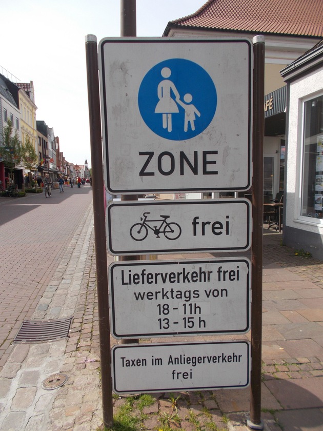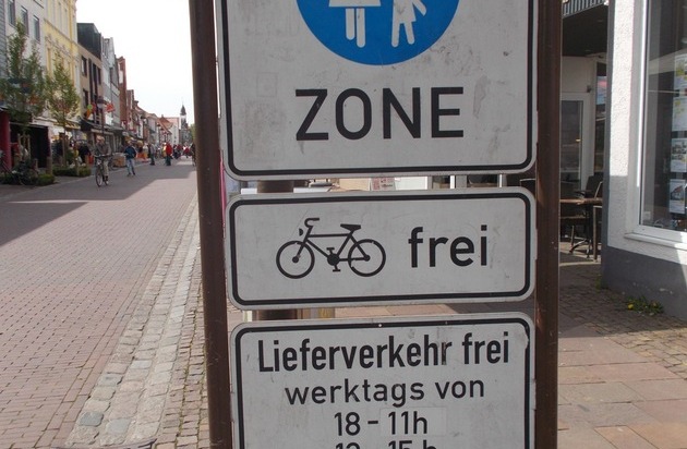 Besondere Aufmerksamkeit erfordern Fußgängerzonen. Hier sind die Regeln oft von Stadt zu Stadt unterschiedlich. In Hannover ist das Radeln grundsätzlich verboten und wird mit einem Verwarngeld von mindestens 15 Euro geahndet. In Nienburg ist das Radfahren in der Fußgängerzone überwiegend erlaubt. Lediglich zum Wochenmarkt und bei Stadtfesten ist es nur eingeschränkt möglich. Dabei gilt immer die besondere Rücksichtnahme auf Fußgänger und die angemessene Geschwindigkeit des Radfahrers.