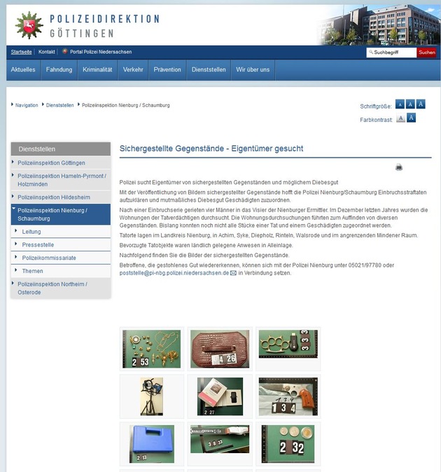 Die Bilder der sichergestellten Gegenstände, von Sammlermünzen, Golfschläger, Sportbogen, über Elektrowerkzeuge sowie Laptops bis hin zu Taschen und Schmuck, sind unter dem Link www.pi-ni.polizei-nds.de veröffentlicht.
