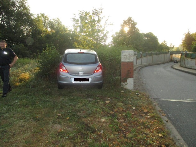 Kurz vor dem Tunnelbeginn an der Bahnunterführung wurde die Fahrzeugführerin so stark von der Sonne geblendet, dass sie offensichtlich kurzzeitig die Orientierung verlor und mit ihrem Pkw über die Gegenfahrbahn knapp neben einem Betonpfeiler in das dortigen Buschwerk fuhr.