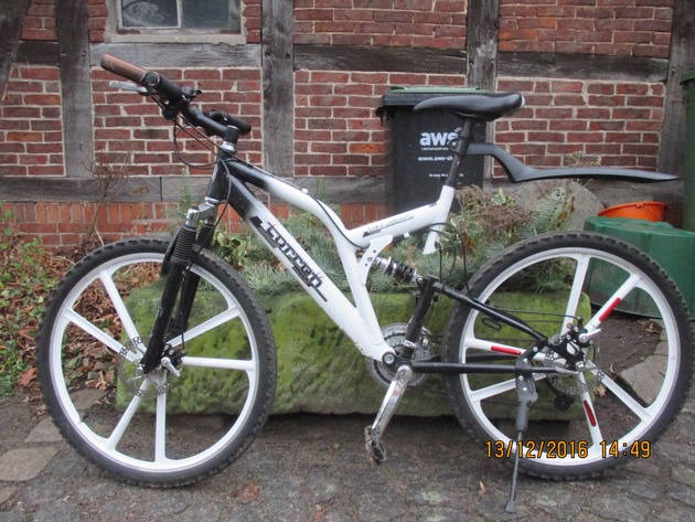 (BER)Die Polizeistation in Hagenburg sucht derzeit den rechtmäßigen Eigentümer eines weißen Mountainbikes der Marke "TORRETH". Das Rad war von einem Spaziergänger am Sonntag Morgen in der Feldmark am Mastendamm in der Nähe des Pumpenhäuschens gefunden worden. Auffällig an dem gepflegten Mountainbike sind die weißen 6-Speichen-Felgen sowie die kupferfarbenen metallenen Bar-Ends. Hinweise auf den Eigentümer bitte an die Polizeistation Hagenburg, 05033 / 6655.