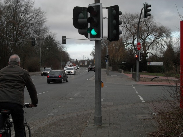 "In der Stadt Nienburg haben wir diese neue Regelung weitgehend gemeinsam besprochen", so Friedhelm Meyer-Leseberg von der Stadt Nienburg, "die technische Umsetzung folgt in Kürze!" Am Beispiel der Einmündung Berliner Ring zur Friedrich-Ebert-Schule oder der Ziegelkampstraße bedeutet dies: Der Radfahrer, der auf dem Radweg an der LSA ankommt, erhält dort einen zusätzlichen Haltebalken markiert. Von hier aus darf er, mit dem Fahrzeugsignal bei "Grün", gleichzeitig mit den Fahrzeugen auf der Fahrbahn, starten. Der Vorteil liegt in einer wesentlich längeren Grünphase. Die bisher für ihn geltende Signalisierung an der Fußgängerfurt wird dahingehend geändert, dass hier eine Streuscheibe mit dem Fußgängersymbol eingesetzt wird! Will er also dort queren, muss er sich auch wie ein Fußgänger verhalten, also absteigen und schieben!", so Meyer-Leseberg.