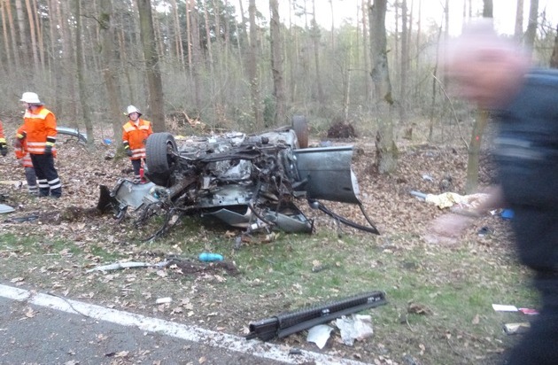 (BER)Am Samstagabend gegen 19.25 Uhr befuhr ein 24 - jähriger Rehburg-Loccumer mit seinem Audi die Landesstraße 370, Husum in Richtung Rehburg. In Höhe des Heye-Sees kam der Fahrer in einer langgestreckten Rechtskurve vermutlich aufgrund nicht angepasster und überhöhter Geschwindigkeit nach links von der Fahrbahn ab, kollidierte mit mehreren Bäumen und kam schließlich auf dem Dach zum Liegen. Der Fahrer sowie sein 22 - jähriger Beifahrer wurden bei dem Unfall schwer verletzt, der 22 - jährige erlag noch in der Nacht seinen schweren Verletzungen. Die Feuerwehren aus Landesbergen und Leese waren mit 35 Kameraden im Einsatz, die L 370 musste von 19.45 Uhr bis 22.00 Uhr komplett gesperrt werden.