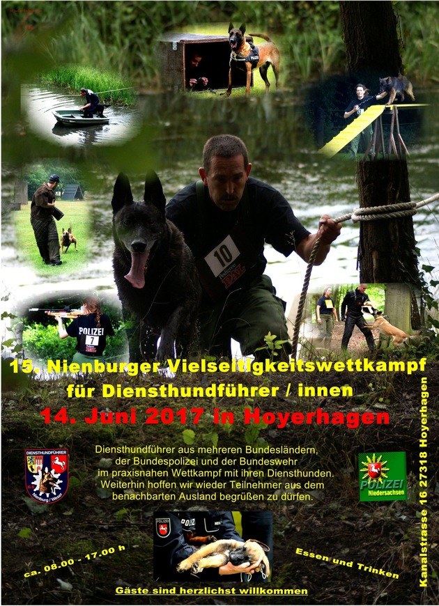 (BER)Nocheinmal möchte die Polizei in Nienburg alle interessierten Menschen aus Nah und Fern zum 15. Vergleichswettkampf der Diensthundführerinnen und Diensthundführer nach Hoyerhagen einladen. Bei freiem Eintritt wird ab 10.00 Uhr ein spannendes und abwechslungsreiches Wettkampfprogramm geboten, bei dem Mensch und Hund extrem gefordert werden. Teams aus vielen Bundesländern sowie eine Mannschaft aus Luxemburg zeigen unter Einsatzbedingungen, wie sie die zum Teil sehr anspruchsvollen Aufgaben lösen. Für Speis und Trank ist gesorgt. Die Polizei freut sich auf viele Besucherinnen und Besucher.