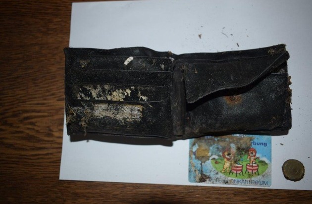 Die Geldbörse war vermutlich Gegenstand aus einer Straftat im letzten Jahrtausend und brachte noch einen guten alten Groschen und eine mittlerweile unüblich gewordene Telefonkarte im Wert von 6 DM zum Vorschein.