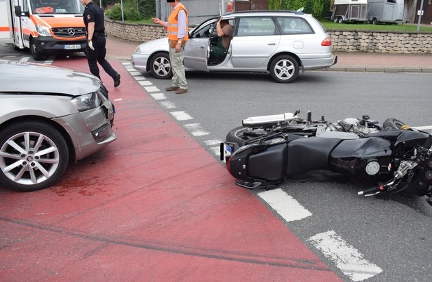 (BER)Am Dienstagnachmittag, 01.08.2017, gegen 15.25 Uhr befuhr ein 61-jähriger Nienstädter mit seiner Honda die Straße Am Schmidebruch in Meerbeck. Im Kreuzungsbereich zur Dorfstraße bzw. Gallweg überquerte ein 68-jähriger Niedernwöhrener mit seinem Pkw die vorfahrtberechtigte Straße, übersah dabei den Kradfahrer und es kam zum Zusammenstoß auf der Kreuzung. Bei dem Sturz wurde der Motorradfahrer erheblich verletzt, so dass der Rettungshubschrauber angefordert wurde. Dieser konnte auf dem Anflug zur Unfallstelle abbestellt werden und unterstützte stattdessen einen Notarzteinsatz bei der Behandlung eines Krankheitsfalles in der Niedernwöhrener Waldstraße. Der verletzte Biker wurde mit einem Rettungswagen mit Verdacht auf Frakturen in das Kreiskrankenhaus Stadthagen gebracht.