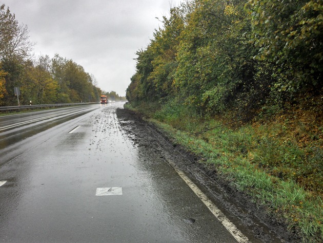 Die Bundesstraße 65 war gestern um 13.00 Uhr im Bereich Bückeburg, Fahrtrichtung Stadthagen, auf einer Länge von ca. 50m derart stark verschmutzt, dass die Beamten die Straßenmeisterei für Reinigungsarbeiten hinzuziehen mussten, weil auf Grund des Regens und der Verschmutzung ein Gefahr für die Verkehrsteilnehmer bestand.