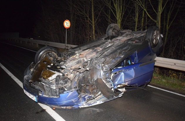 In der Nacht von Freitag auf Samstag kam es auf der Eisenbahnüberführung der Hobbenser Straße zu einem Verkehrsunfall der nicht alltäglichen Art. Ein 26jähriger Helpser befuhr gegen 23:20 Uhr die Brücke aus Meerbeck kommend in Richtung Enzen. Dabei geriet er vermutlich aufgrund nicht angepasster Geschwindigkeit nach rechts von der Fahrbahn ab, überfuhr mit dem Fahrzeugunterboden die ansteigende Leitplanke und kollidierte dann mit einem Geländer. Durch die Wucht des Aufpralls wurde der Pkw zurück auf die Fahrbahn geworfen und landete auf dem Dach. Anschließend rutschte der Pkw noch ca. 150 Meter weiter und kam auf der Gegenfahrbahn zum Liegen. Der alleinbeteiligte Fahrzeugführer wurde bei diesem Unfall wie durch ein Wunder nur leicht verletzt und konnte sich selbstständig aus dem schwer beschädigten Fahrzeug befreien. Bei der Unfallaufnahme wurde bei dem Mann Alkoholgeruch festgestellt. Eine Blutprobenentnahme wurde angeordnet und der Führerschein sichergestellt.