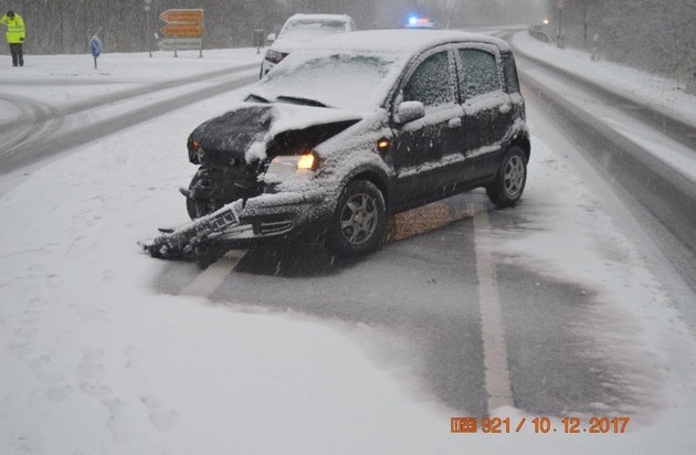 Um 15.00 Uhr krachte es in der Gemarkung Bückeburg auf der Bundesstraße 83. Dort wollte eine 35jährige Frau aus Bad Oeynhausen mit ihrem Pkw Fiat aus Richtung Hasengarten kommend nach links in die Abfahrt zur Rintelner Straße abbiegen. Die Frau übersah durch den starken Schneefall einen entgegenkommenden weißen Pkw VW eines Fahrzeugführers aus Gronau.. Im Einmündungsbereich stießen beide Fahrzeuge zusammen.