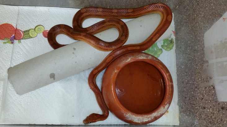 NORTHEIM (fal) - Auf einem Grundstück am Northeimer Burgweg (Stichstraße hinter dem Finanzamt) fand eine Anwohnerin am 20.12.2014 eine quicklebendige Schlange. Bei der etwa einen Meter langen Schlange handelt es sich nach Expertenauskunft um eine ungiftige nordamerikanische Kornnatter. Das vermutlich aus einem Terrarium entwichene Kriechtier wurde eingefangen und in der Schlangenfarm in Schladen artgerecht untergebracht.
