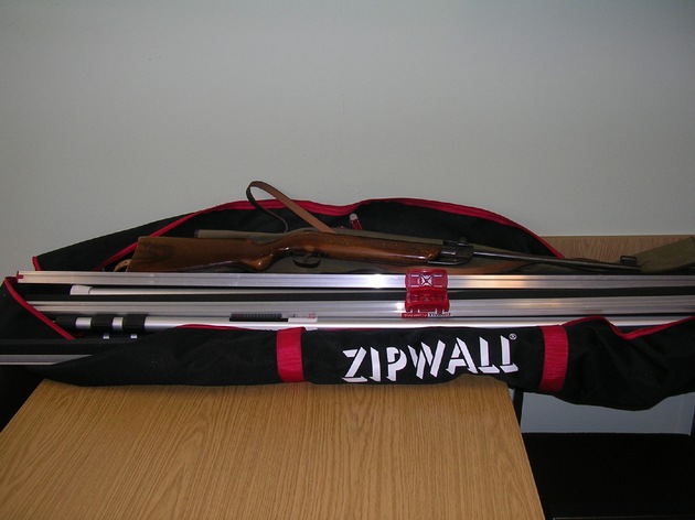 OSTERODE (RCH/us) Am 09.03.15 versuchte eine unbekannte Person bei einem Osteroder Waffenhändler eine Tasche mit einem ZIPWALL-System (Staubschutzwand) und ein schrottreifes Luftgewehr zu verkaufen (Foto in Anhang). Als der Waffenhändler ablehnte, warf der offensichtlich angetrunkene Verkaufsinteressent die Gegenstände auf den Boden und entfernte sich. Aufgrund des Verhaltens der suspekten Person ist nicht auszuschließen, dass die angeboten Gegenstände aus einer Straftat stammen. Geschädigte werden gebeten, sich bei der Polizei, unter der Tel. 05522/508-0, zu melden.