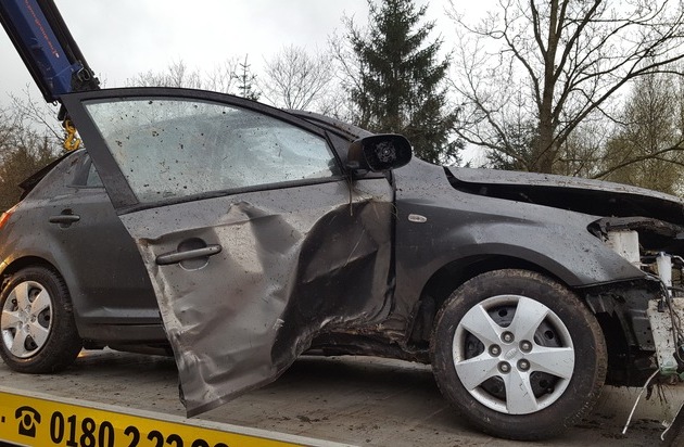 B243 - (NEI) Am Sonntagmorgen befuhr eine 19jährige Herzbergerin mit ihrem PKW die B243 in Richtung Herzberg. In Höhe von km 26,1 (Bereich Aschenhütte) geriet die Herzbergerin ,aus bisher nicht abschliessend geklärten Gründen, nach rechts von der Fahrbahn. Hier fuhr sie auf eine abgesenkte Schutzplanke auf, worauf sich ihr PKW überschlug. Das Fahrzeug hob für mehrere Meter vom Boden ab und kam letztendlich nach ca. 100 Metern, nach dem Aufprall an einem Baum zum stehen. Die alleine im PKW befindliche Fahrzeugführerin blieb nahezu unverletzt. Der PKW war nicht mehr fahrbereit.