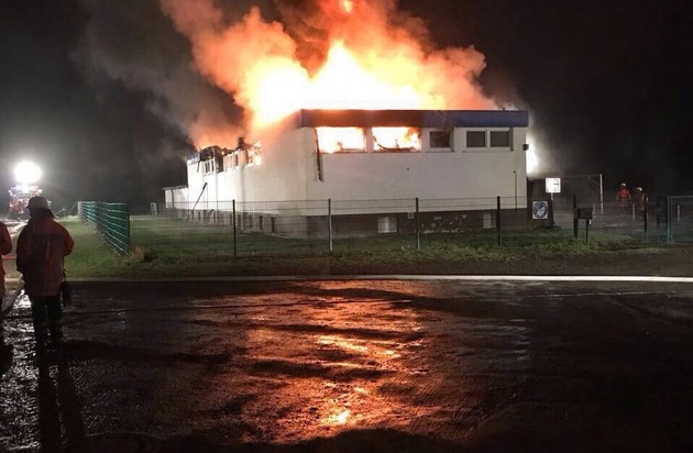 HATTORF (US) Am Dienstag, den 07.11.17 um 02:37 Uhr wurde der Polizei ein Brand in Hattorf, in der Straße "Am Sportplatz" gemeldet. Beim Eintreffen der Polizeikräfte stand das Sporthaus der Samtgemeinde Hattorf in Vollbrand. Das gesamte Objekt wurden durch den Brand vollends zerstört. Vor Ort waren ca. 80 Kräfte der Feuerwehren aus den umliegenden Gemeinden im Einsatz. Der geschätzte Gesamtschaden beläuft sich auf ca. 200.000,-- Euro. Mittlerweile haben Brandursachenermittler der Polizei die Arbeit aufgenommen. Zeugen, die Hinweise zur möglichen Brandentstehung geben können, werden gebeten sich beim Polizeikommissariat in Osterode unter der Tel.-Nr. 05522/508-0 zu melden.