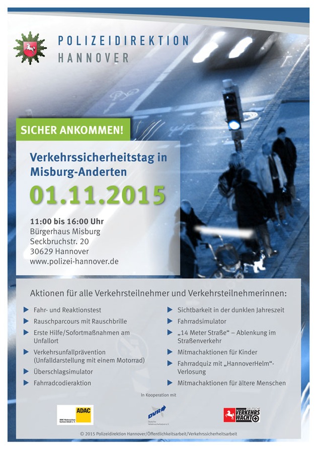 Am Sonntag, 1. November 2015, veranstaltet der Stadtbezirk Misburg-Anderten in Zusammenarbeit mit der Polizeiinspektion Süd im Bürgerhaus Misburg von 11:00 Uhr bis 16:00 Uhr den ersten Verkehrssicherheitstag. Hierzu laden wir alle Interessierten herzlich ein.