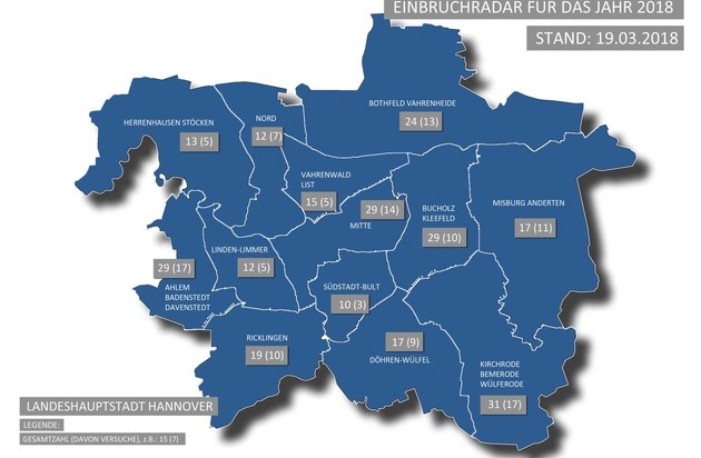 Jeweils montags, um 15:00 Uhr, wird die Behörde nun wöchentlich fortgeschriebene Zahlen zu Wohnungseinbruchdiebstählen auf zwei Karten für die Landeshauptstadt und das Umland veröffentlichen. Die Daten dienen der zahlenmäßigen, statistischen Entwicklung und sollen einen Überblick über die regionale Verteilung der Einbrüche sowie Einbruchversuche im Zuständigkeitsbereich der PD Hannover geben. Die zur Verfügung gestellten Daten sind von der Polizei unbewertet.