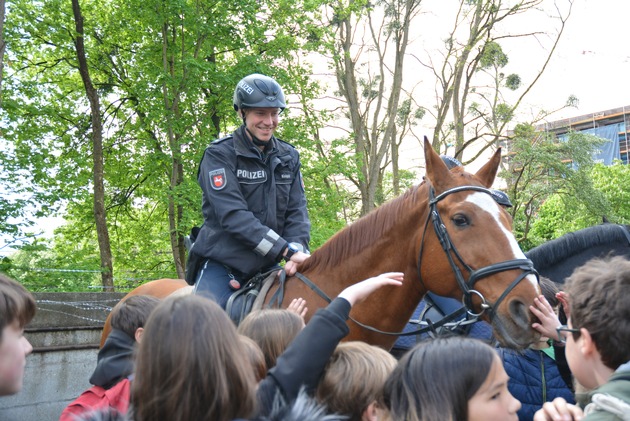 Zum Abschluss gab es für die Schülerinnen und Schüler noch drei spezielle Vorführungen: Einsatztrainer zeigten ihnen, wie eine Festnahme abläuft und die Reiter- und Diensthundführerstaffel beeindruckte die jungen Gäste mit ihren Darbietungen.