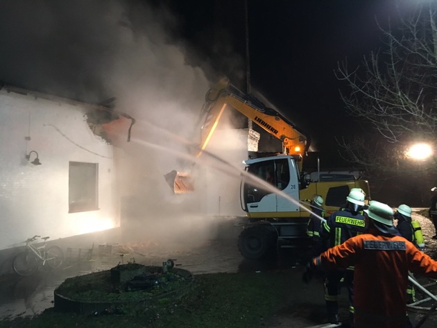 Als im späteren Einsatzverlauf das Feuer auf das Wohnhaus und den Dachstuhl übergriff war ein Innenangriff nicht mehr möglich. Mit einem Bagger wurde das Dach und ein Teil der Wände geöffnet, um mit der nachalarmierten Drehleiter aus Kappeln weitere Löscharbeiten durchführen zu können.
