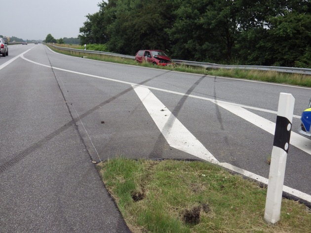 BAB 27 - Gemarkung Hagen. Am Freitag, dem 24. Juni 2016, kam es auf der BAB 27 gegen 14.50 Uhr zu einem Verkehrsunfall. Eine 19-jährige Bremerhavenerin fuhr mit ihrem Pkw VW die Bundesautobahn in Fahrtrichtung Cuxhaven, als sie infolge von Unaufmerksamkeit das Lenkrad ihres Pkw verriss, nach links in die Mittelschutz prallte und anschließend gegenüber heftig gegen die Seitenschutzplanke stieß.