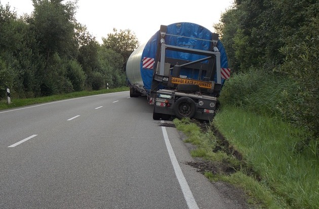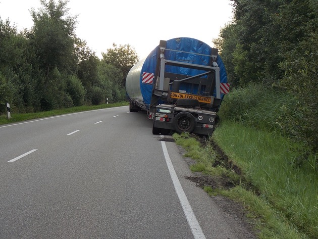 Als der Transporter nach dem Reifenwechsel seine Fahrt fortsetzen wollte, platzte ein weiterer Reifen, und der Schwerlastzug kam mit der rechten Seite der Hinterachse in den Seitenraum ab. Wegen des hohen Gesamtgewichts von ca. 100 Tonnen konnte das Gespann nicht aus eigener Kraft wieder auf die Straße gelangen.