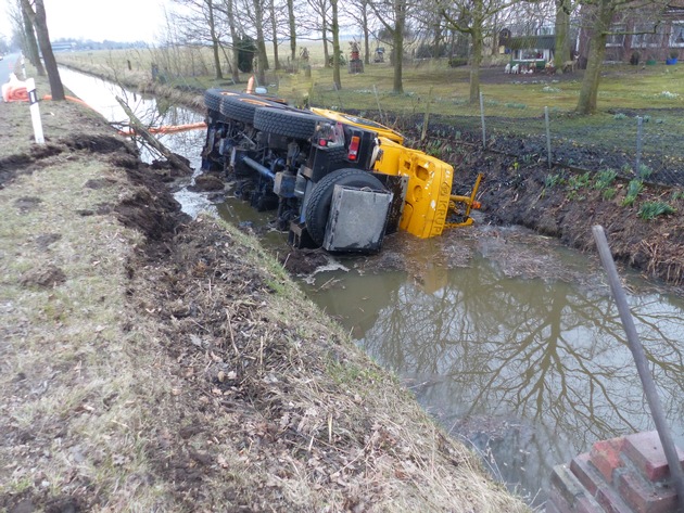 Ihlienworth. Am Samstag, dem 24. März 2018, fuhr ein 49-jähriger Ihlienworther als Fahrzeugführer gegen 17.00 Uhr mit dem Mobilkran, Hersteller Krupp, auf der Straße Mislag, Kreisstraße 20, in Fahrtrichtung Odisheim. Dabei geriet das Fahrzeug aus noch nicht geklärter Ursache in den Seitenraum der Straße und kippte zur Seite in einen angrenzenden wasserführenden Graben. In diesem blieb das Fahrzeug auf der Seite liegen. Glücklicherweise wurde der Fahrzeugführer dabei nicht verletzt. Beschädigt wurde des Weiteren ein Baum und eine Grundstückszufahrt. Durch die eingesetzte Freiwillige Feuerwehr Ihlienworth wurden Ölsperren in dem Graben ausgelegt. Die Gesamtschadenshöhe steht zum jetzigen Zeitpunkt noch nicht fest.