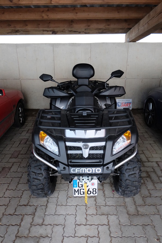 Das Quad der Marke Zheijang CF Moto hat die Bezeichnung "Terralander 800" und war nahezu neuwertig. Der Schaden beträgt nach Angaben des Besitzers etwa 10.000 Euro. Die Polizei bittet Zeugen, die das Quad in der Nacht zum 07.08.2015 oder danach gesehen haben, oder auch Hinweise zum Verbleib machen können, sich unter Telefon 0551/491-2117 zu melden.