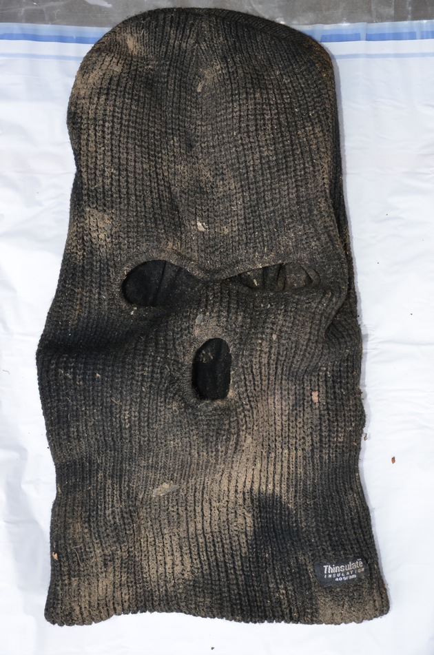 Anhand des vorliegenden Bildmaterials aus der Überwachungskamera konnte die gefundene Bekleidung den beiden Räubern wie folgt zugeordnet werden: