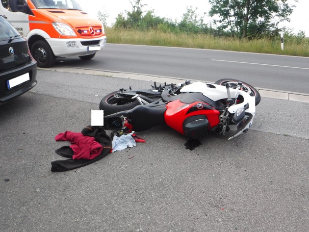 Der Fahrer des Kraftrads verletzte sich bei dem Crash schwer. Mit einem RTW wurde er in ein Krankenhaus gefahren, in dem er stationär verblieb. Sein nicht mehr fahrbereites Motorrad transportierte ein Abschleppunternehmen von der Unfallstelle ab. Der Sachschaden wurde auf etwa 2500 Euro geschätzt.