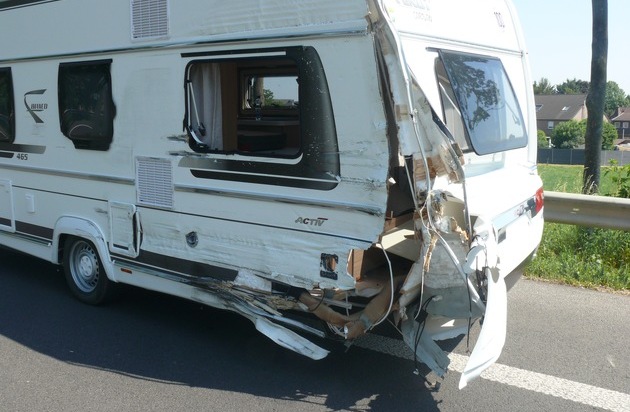 Zur Unfallzeit war ein 60-Jähriger aus Hückelhoven mit seinem Pkw samt Wohnanhänger auf der B 55 aus Richtung Autobahn kommend in Richtung Welldorf unterwegs. In einer Rechtskurve geriet der Anhänger ins Schleudern und drehte sich quer zur Gegenfahrbahn. Hier war zu dem Zeitpunkt ein 66-Jähriger aus Lingen mit seinem Wohnmobil unterwegs. Sein Fahrzeug und der Wohnanhänger stießen zusammen. Durch den Unfall wurden sowohl der 66-Jährige als auch seine 63-jährige Beifahrerin verletzt. Beide mussten mit RTW in umliegende Krankenhäuser gebracht werden. Der Fahrer des Pkw und seine Beifahrerin hingegen kamen mit dem Schrecken davon und blieben unverletzt. Es entstand Sachschaden in Höhe von circa 12000 Euro. Für die Dauer der Unfallaufnahme musste die B 55 zwischen der Anschlussstelle Jülich-Mersch und der Einmündung L 241 voll gesperrt werden.